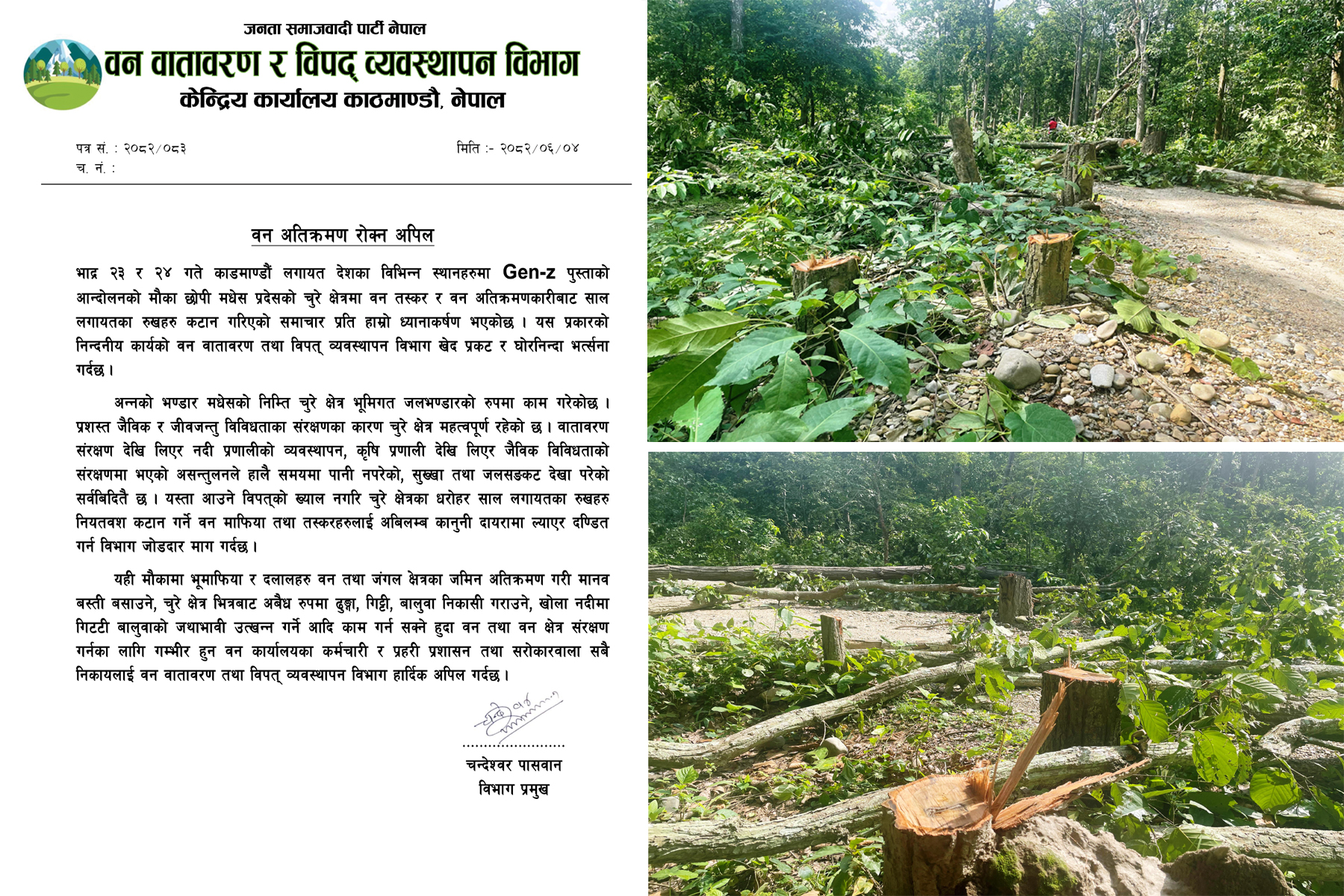 मधेश प्रदेश जसपा नेपालको वन वातावरण र विपद् व्यवस्थापन विभागले महोत्तरीको टुटेश्वरनाथ साझेदारी वनमा भएको रुख अनियमित कटानप्रति गम्भीर आपत्ति जनाउँदै दोषीहरूमाथि तुरुन्त कारबाहीको माग [Read More…]