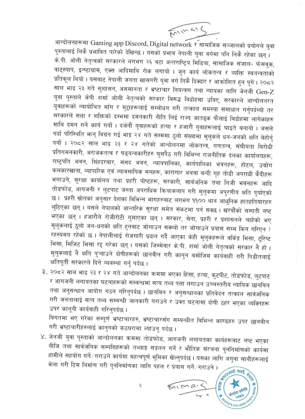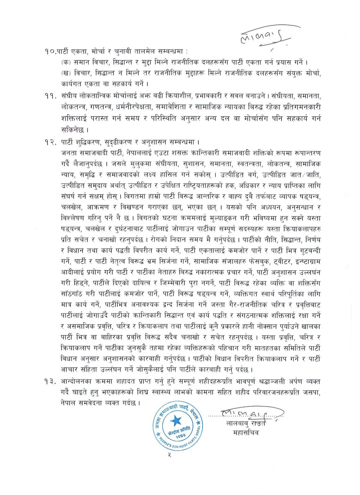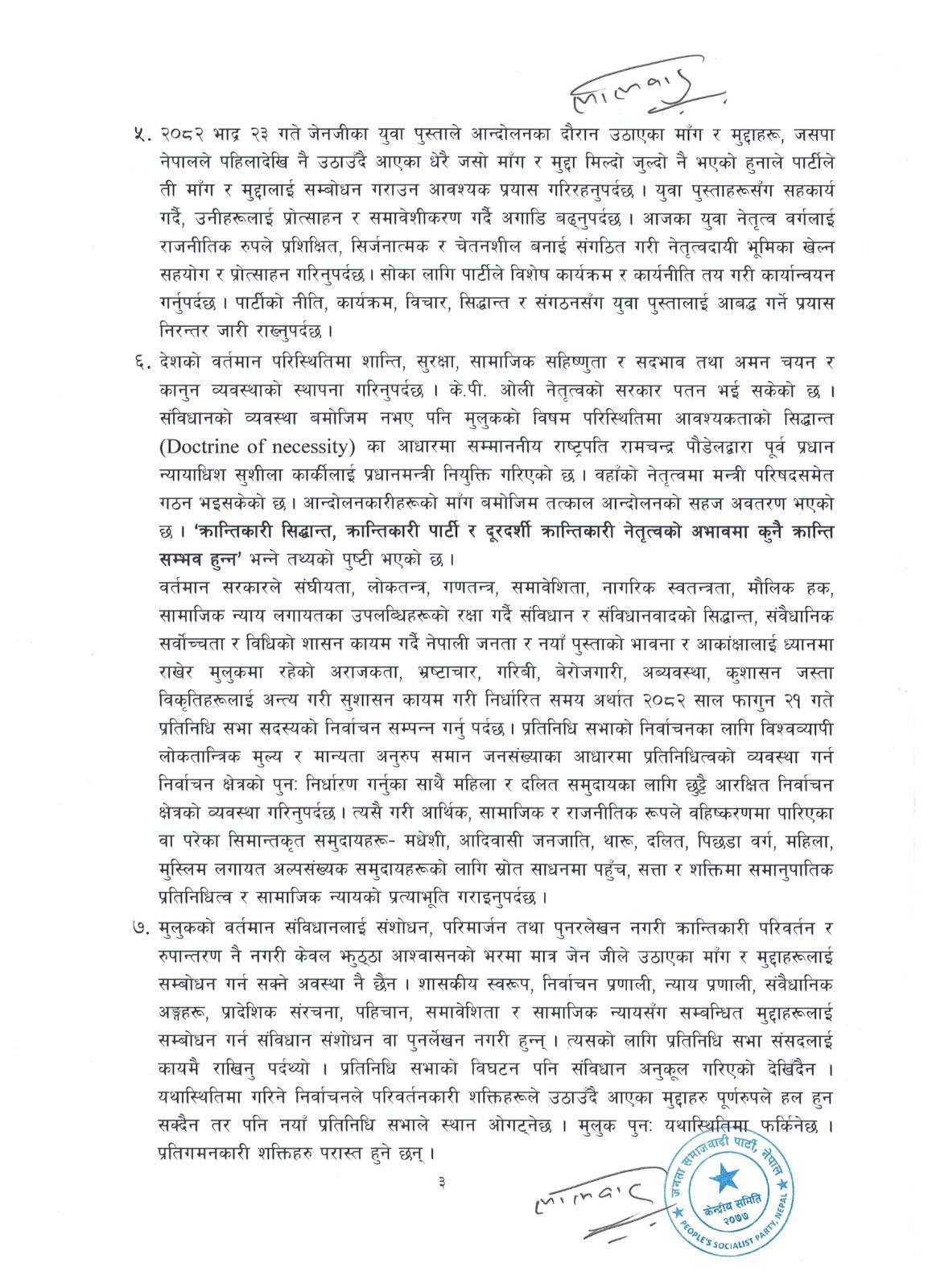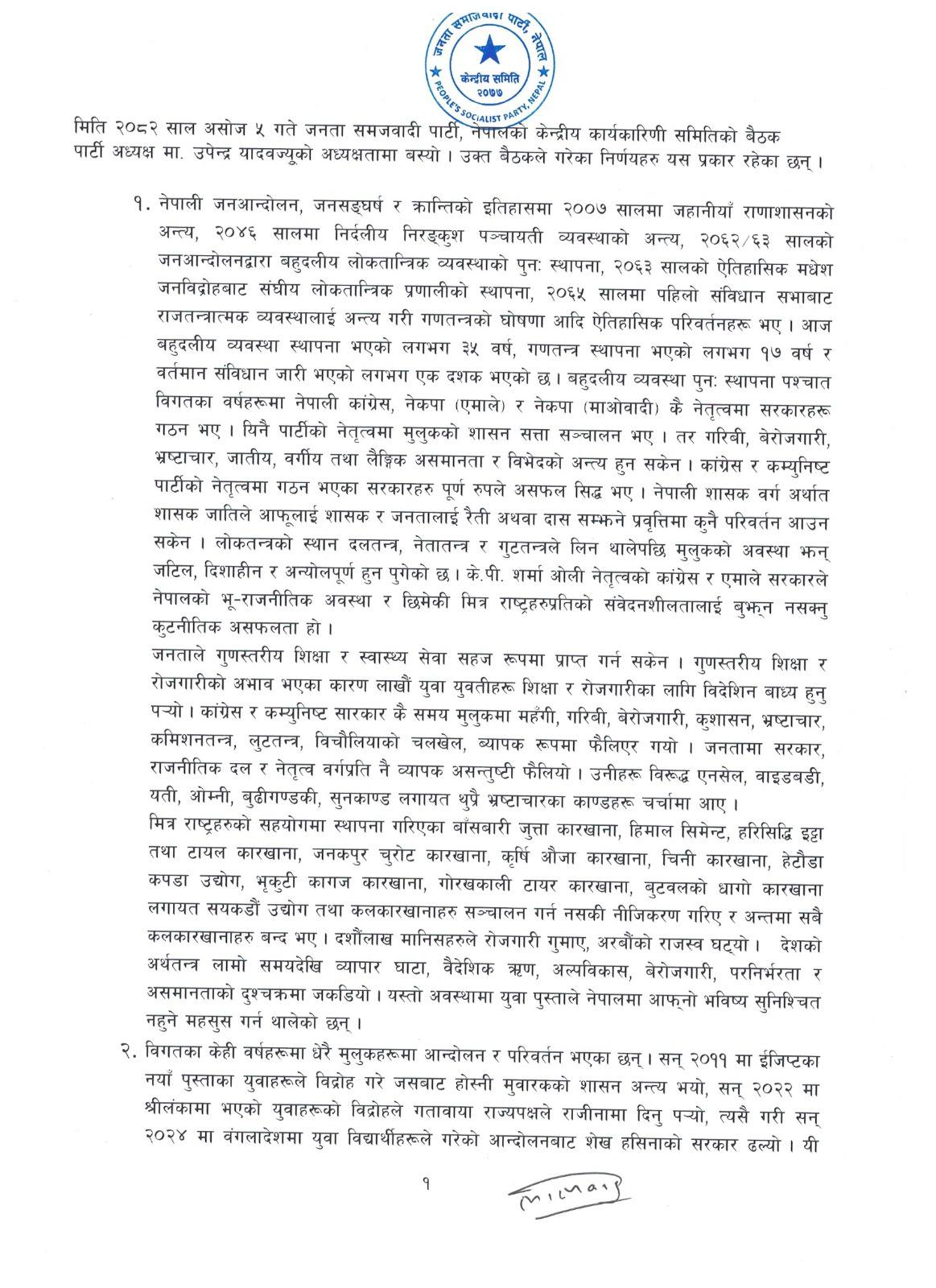 जनता समाजवादी पार्टी नेपाल । हालै नेपालमा भएको जेनजी आन्दोलन पश्चात जसपा नेपाल राष्ट्रिय अध्यक्ष उपेन्द्र यादवको अध्यक्षतामा पहिलो पटक केन्द्रिय कार्यकारीणी वैठकले १३ वुंदे निर्णय पास गर्दै वैठक समापन गरेको छ ।